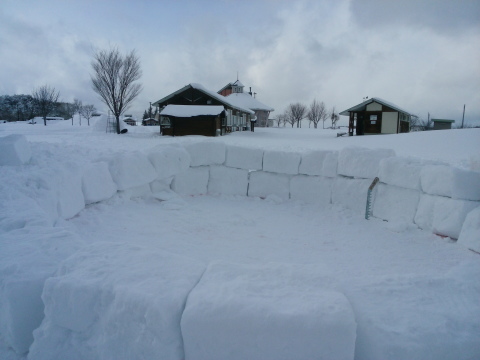 | 雪の塊をブロック状に切り出して、下から螺旋を描くように互い違いに積み上げることでかかる力を分散し、ドーム状に積み上げる。 | |||